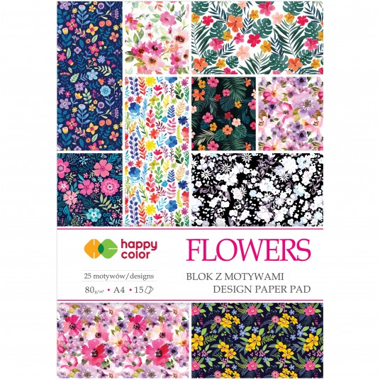 Blok z motywami flowers, A4, 80g/m2, 15 arkuszy, 25 motywów, Happy Color