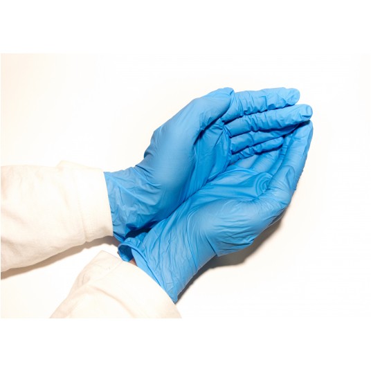 Jednorazowe, nitrylowe rękawice diagnostyczne z rolowanym mankietem. Produkt cechuje chlorowana i polimerowana powierzchnia wewnętrzna, a z zewnątrz tekstura polimerowana i teksturowana na końcach palców. Wyrób niesterylny i bezpudrowy, zgodny z normami technicznymi, dopuszczony do kontaktu z żywnością.