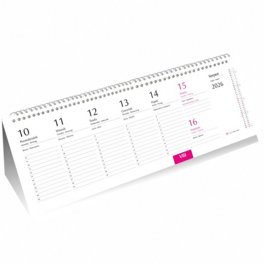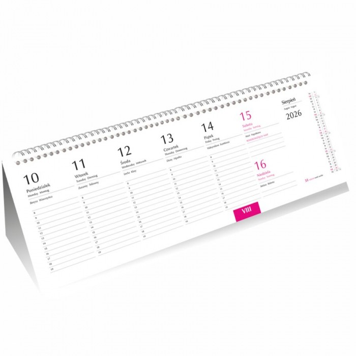 - Układ kalendarium: 1 tydzień - 1 strona