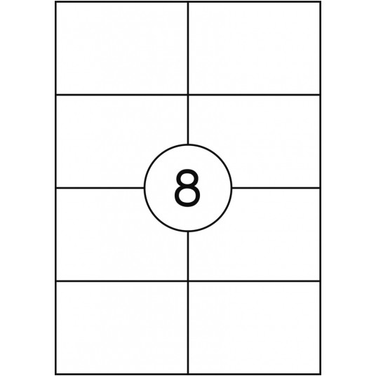 klasyczne etykiety samoprzylepne, odpowiednie do drukarek laserowych, atramentowych i kserokopiarek rozmiar etykiety: 105x74mm liczba etykiet na arkuszu: 8 gramatura: front 70gsm, podkład 75gsm białość: 148 ± 5 CIE QCT - Quatro Clean Technology - ochronne pole wzdłuż krawędzi etykiety, które zapobiega odkładaniu się kleju na mechanizmie drukarki 100 arkuszy w opakowaniu kolor: biały