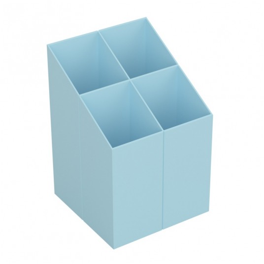 przybornik na biurko, niezbędny do podstawowej organizacji akcesoriów biurowych trwały i stabilny wykonany z odpornego na pęknięcia tworzywa z czterema przegrodami o głębokości 90 mm i 110 mm wymiary: 75 x 75 x110 mm kolor: pastelowy niebieski
