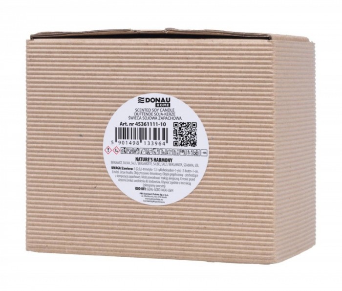 - Odkryj magiczny świat zapachów ze świecą sojową Nature's Harmony - Świeca wykonana w 100% z naturalnego wosku sojowego z drewnianym knotem - Umieszczona w szklanym słoiku, który pochodzi z polskiej huty szkła - Wyposażona w elegancką, drewnianą pokrywkę chroniącą święcę przed kurzem i zachowującą jej świeżość - Produkt wegański, kompozycja zapachowa posiada certyfikat zgodności IFRA, co gwarantuje najwyższą jakość i bezpieczeństwo użytkowania - Zapach: Harmonia Natury (nuty zapachowe - nuty głowy: bergamotka, szałwia; nuty serca: jaśmin, sól; nuty bazy: sosna, bursztyn) - Czas palenia: ok. 40 godzin (czas palenia jest zależny od sposobu użytkowania świecy, warunków panujących w pomieszczeniu, przycinania knota oraz długości pojedynczych sesji palenia) - Pojemność: 280ml - Waga wosku netto: 200g - Wyprodukowana w Polsce
