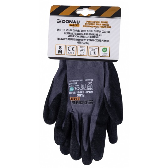 - Rękawice wykonane z dobrej jakości dzianiny nylonowej z elastanem w kolorze szarym, powleczone w części chwytnej ultradrobną pianką nitrylową w kolorze czarnym - Przeznaczone do prac montażowych, magazynowych, mechanicznych, serwisowych, transportowych, budowlanych, remontowych, przemysłowych, rolniczych, ogrodowych oraz zajęć hobbistycznych - Powłoka z ultradrobnej pianki nitrylowej zapewnia bardzo dużą odporność na ścieranie - Wysoki komfort użytkowania, doskonałe dopasowanie do dłoni oraz wysoka oddychalność - Duża manualność oraz precyzyjny chwyt - doskonały wybór przy pracach montażowych - Zwiększona odporność na oleje oraz smary - Zakończone elastycznym ściągaczem - OEKO-TEX® STANDARD 100 - Rękawice ochronne chroniące przed uszkodzeniami mechanicznymi - kat: II - Zgodność z normami EN 388:2016+A1:2018 (4131X), EN ISO 21420:2020 - Ścieg: 15g - Materiały: nylon, elastan/pianka nitrylowa - Kolor: szaro-czarny - Rozmiar: 8
