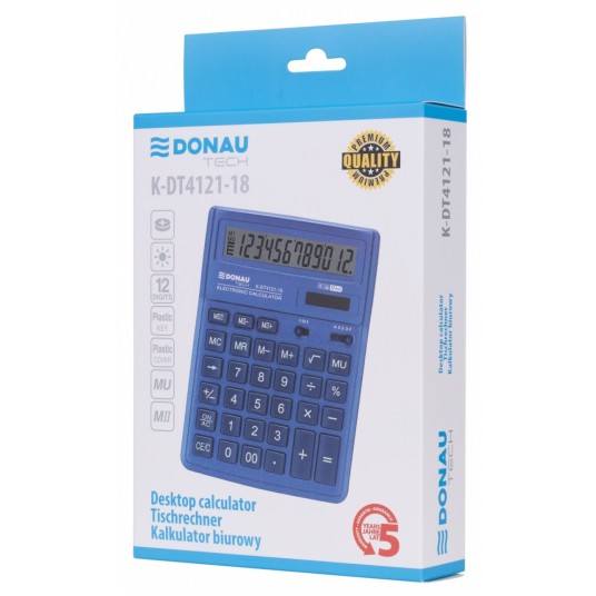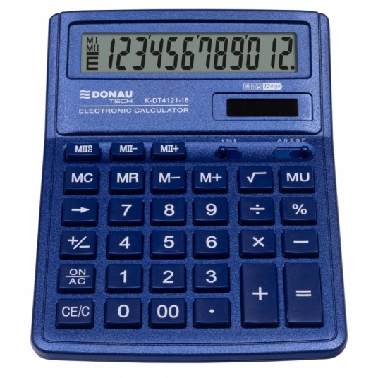 kalkulator biurowy z 12-cyfrowym wyświetlaczem z zasilaniem bateryjno-solarnym wymiary: 190 x 143 x 40 mm funkcja pierwiastka kwadratowego oraz obliczania procentów, obliczanie marży MU, podwójne zero, kasowanie ostatniej pozycji, podwójna pamięć, ustawienie dziesiętne, zaokrąglanie wyniku wyłącza się automatycznie instrukcja obsługi w języku polskim 5 lat gwarancji kolor: granatowy