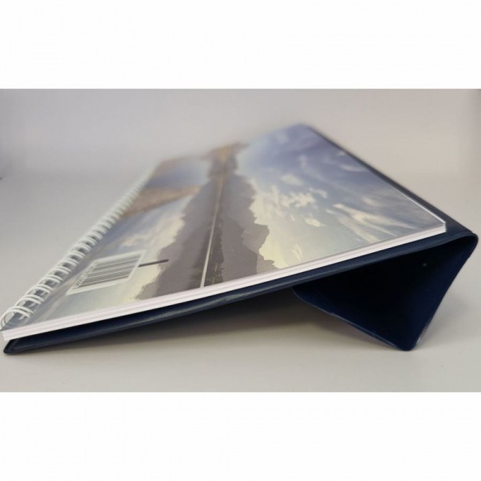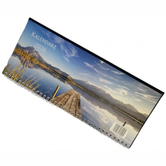 - Wymiary: 29,5 x 12,2 mm - Kalendarium: jeden tydzień na jednej stronie, w dolnym rogu skrócony kalendarzyk 3 miesięcy - Wykończenie: podstawa usztywniona PCV z możliwością położenia pod kątem, spirala (grzbiet drutowy) w kolorach białym, niebieskim lub czerwonym, kod kreskowy na okładce - Kolorystyka: niebiesko-czerwony, czarno-czerwony - Ilość stron: 56 stron - Papier: Papier ekologiczny, 70g/m2 - Opcja: indywidualna okładka, opakowania zbiorcze po 10 sztuk