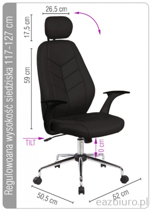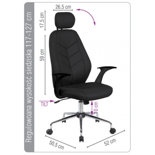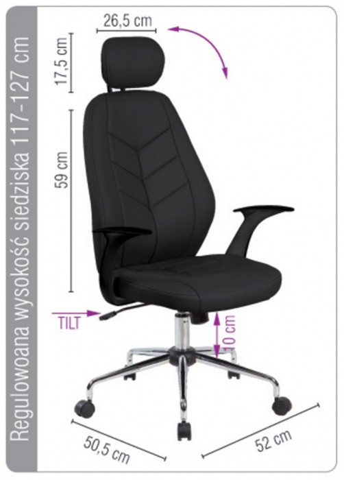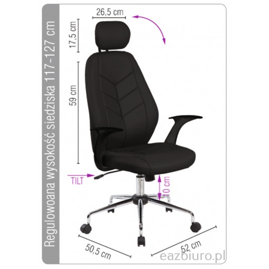 - Ergonomiczny fotel biurowy z mechanizmem typu TILT - Możliwość swobodnego kołysania or blokady pozycji do pracy - Regulacja wysokości siedziska w zakresie: 117-127 cm - Komfortowe i ergonomiczne oparcie ze zintegrowanym zagłówkiem w - rozmiarze 26,5 x 17,5 cm - Wykonane z ekoskóry - Plastikowe podłokietniki - Stalowa podstawa - Maksymalne obciążenie statyczne: ok. 800 kg - Szerokość siedziska: 52 cm (w najszerszym punkcie) - Głębokość siedziska: 50,5 cm (w najszerszym punkcie) - Szerokość oparcia: 52 cm (w najszerszym punkcie) - Wysokość oparcia: 59 cm (wysokość robocza) - Kolor: czarny