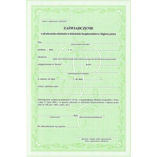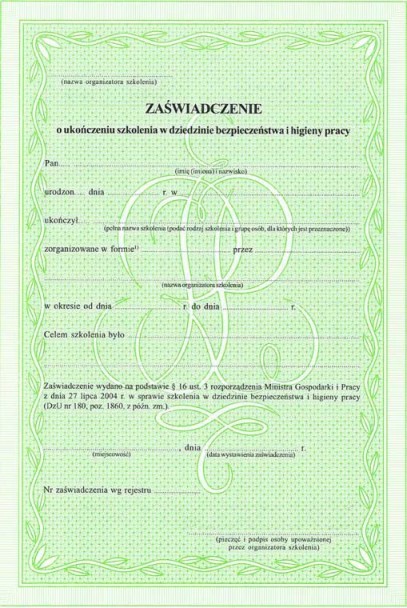 ZAŚWIADCZENIE O UKOŃCZENIU SZKOLENIA W DZIEDZINIE BHP - zaświadczenie o ukończeniu szkolenia w dziedzinie BHP. Format: A-4