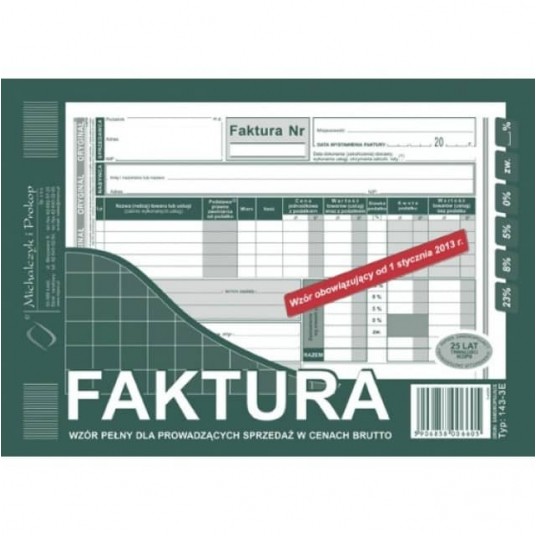 - Format: A5 poziom - Rodzaj papieru: samokopiujący - Zastosowanie: faktury i inne dokumenty wynikające z przepisów o podatku od towarów i usług - Oprawa: bloczek 80 kartek - Druk: jednostronny (oryginał + kopia)