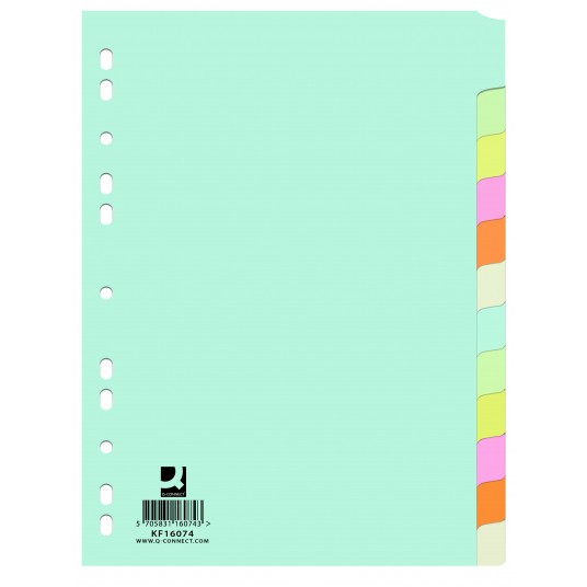 - wykonane z kartonu o gramaturze 175gsm - ilość kolorowych przekładek: 12 - dziurkowanie: 11 - format: A4 - rozmiar przekładki: 223x297mm - każdy komplet osobno pakowany w folię - mix kolorów