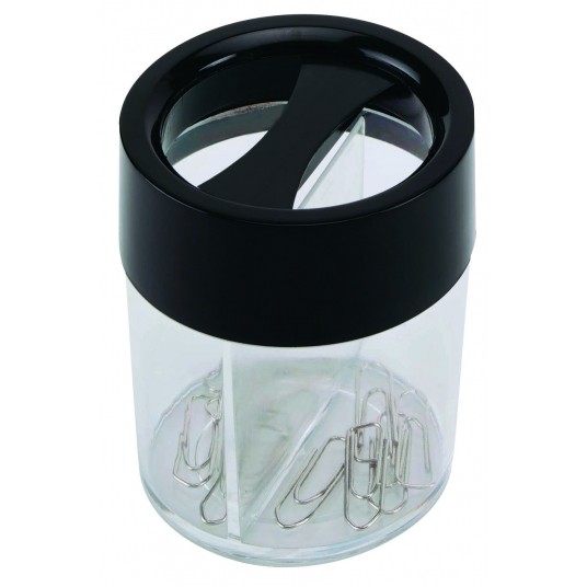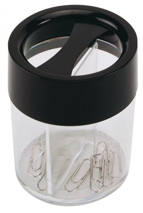 - wykonany z plastiku - górna czarna część z magnesem i okrągłym otworem do wyjmowania spinaczy - dolna część - transparentna - okrągły - rozmiar (wys. x śr.): 70x60mm - kolor transparentny czarny - 16 spinaczy GRATIS