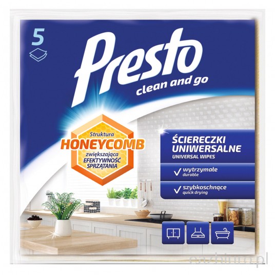 - Suche ściereczki uniwersalne Presto przeznaczone są do czyszczenia wszystkich gładkich powierzchni zmywalnych - Dzięki specjalnie opracowanej strukturze honeycomb skutecznie zbierają kurz i brud - Ściereczki są wytrzymałe oraz wyjątkowo delikatne dla powierzchni, nie pozostawiają smug - Przed użyciem należy zwilżyć ściereczkę - Po użyciu ściereczka może zostać wypłukana pod bieżąca woda, a następnie wysuszona do ponownego użycia - Ściereczka szybko wysycha - 5 ściereczek w opakowaniu - Kolor: żółty