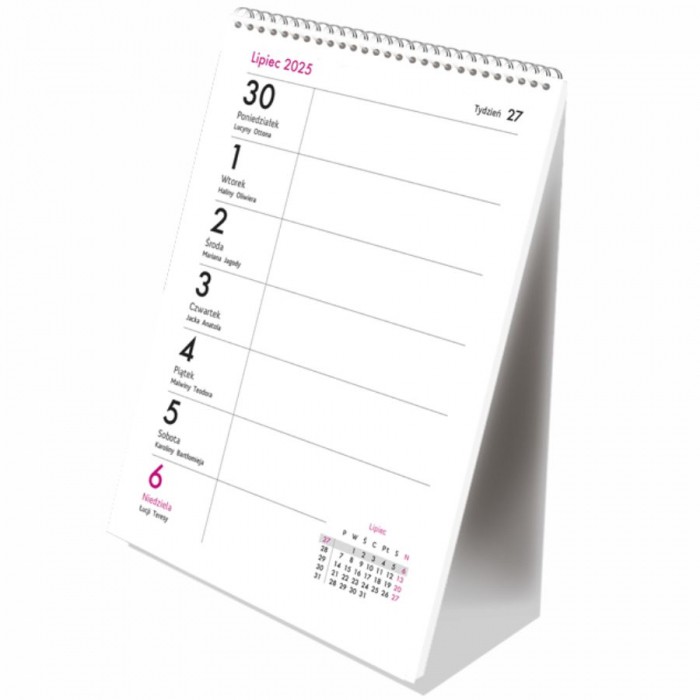- Układ kalendarium: 1 tydzień - 1 strona