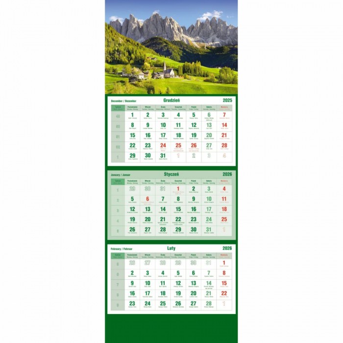 - Układ kalendarium: 1 miesiąc - 1 kartka