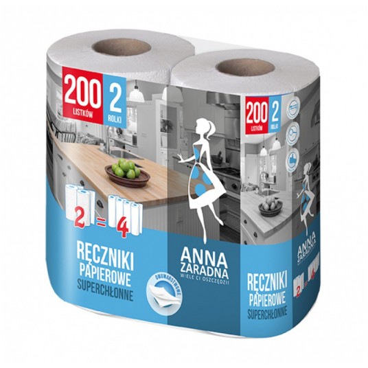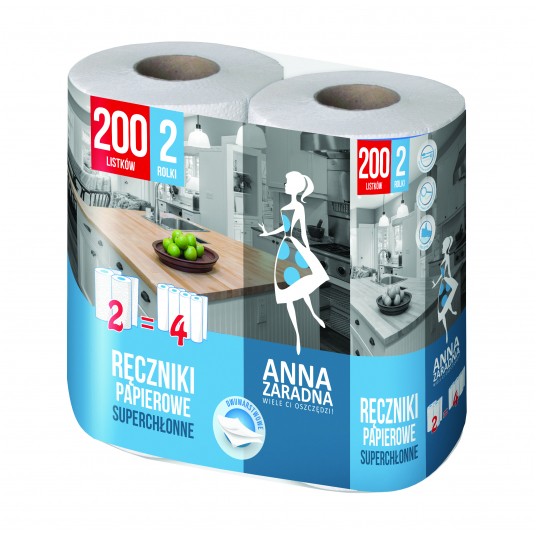 - Ręczniki papierowe super chłonne - Odpowiadają 4 zwykłym rolkom - Są wytrzymałe i dzięki tłoczeniu bardziej chłonne - Szybko wchłaniają tłuszcz i wodę oraz skutecznie wycierają plamy i zabrudzenia - Testowane dermatologicznie i alergologicznie - Posiadają obojętne pH i atest do kontaktu z żywnością - Są bezzapachowe i bardzo wytrzymałe - Nie pozostawiają resztek włókien na powierzchniach i odsączanych potrawach - Długość 1 listka 18,8 cm - Szerokość 1 liska 22,5 cm - 2 rolki w opak. - Liczba listków na 1 rolce 100 szt. - Kolor biały z niebieskim tłoczeniem