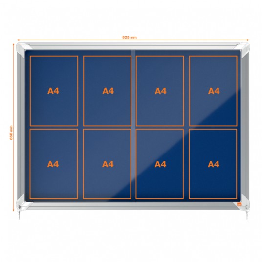 - Filcowa gablota z przesuwanymi szklanymi drzwiami, zamykana na klucz, mocowana do ściany w narożnikach. - Rozmiar: 8 kartek A4, 925 x 668 mm zamykana gablota ogłoszeniowa, gablota ogłoszeniowa, gablota, zamykana przeszklona gablota, szklana gablota