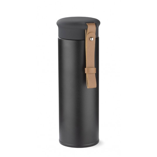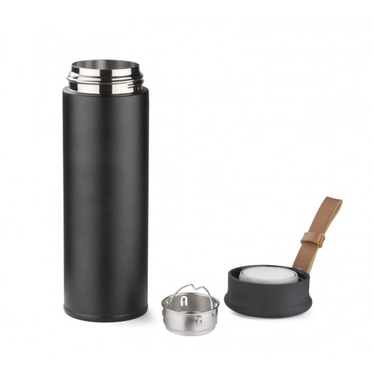 - Butelka termiczna MACHO łączy w sobie elegancki wygląd i wysoką jakość wykonania. - Dzięki próżni między ściankami trzyma temperaturę ok. 13 godzin. - Wykonana ze stali nierdzewnej 304. - Przykrywka pokryta jest powłoką soft touch, co sprawia, że jest przyjemna w dotyku, a pasek z ekoskóry dodatkowo wpływa na wygodę użytkowania. - Wewnątrz znajduje się sitko, dzięki któremu możemy zaparzyć herbatę. - Wymiary: ⌀ 70 x 202 mm - Materiał: metal, tworzywo, ekoskóra - Kolor: czarny