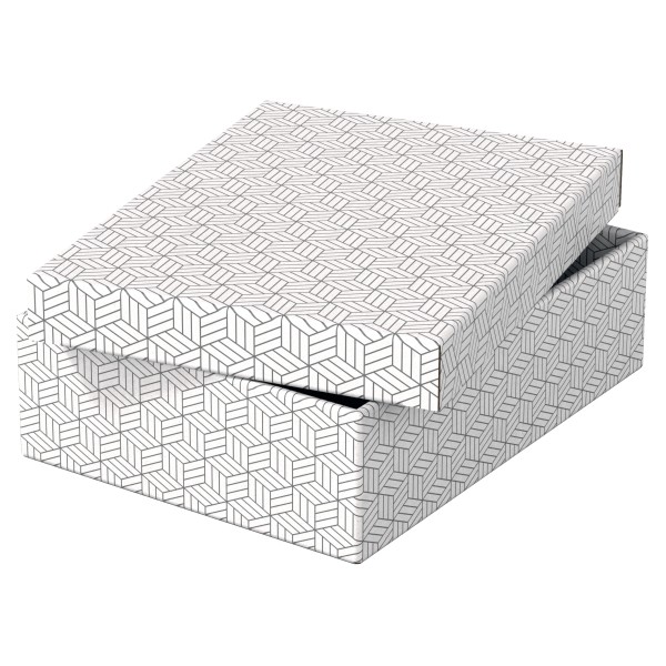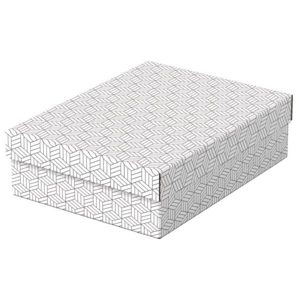 - Zestaw trzech średniej wielkości tekturowych pudełek do przechowywania ze stylowym i nowoczesnym geometrycznym wzorem na powierzchni.