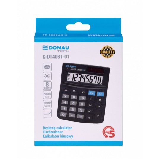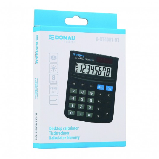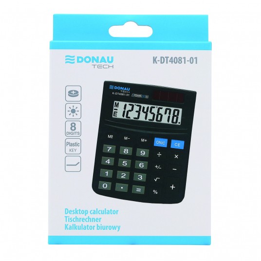 - Kalkulator biurowy z 8-cyfrowym wyświetlaczem z zasilaniem bateryjno -solarnym - Wymiary: 134 x 104 x 17 mm - Funkcja pierwiastka kwadratowego oraz obliczania procentów - Wyłącza się automatycznie - 5 lat gwarancji - Kolor: czarny
