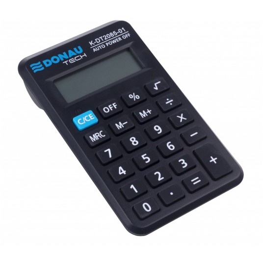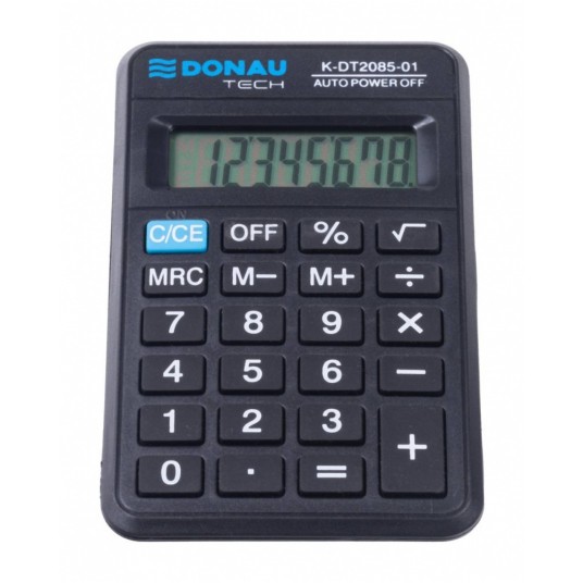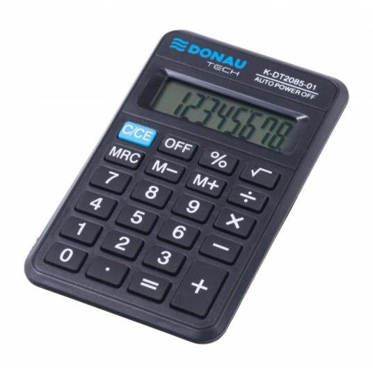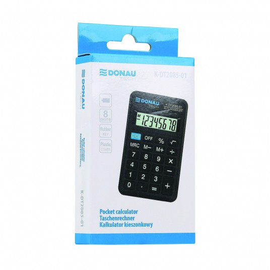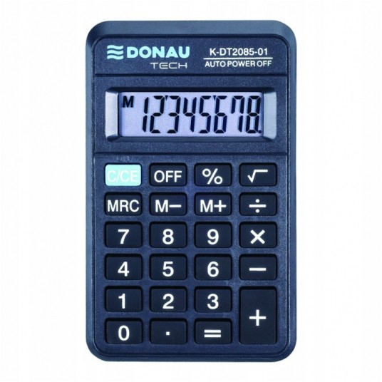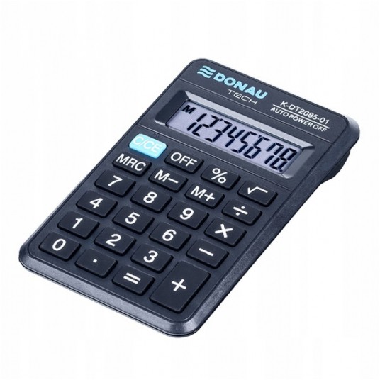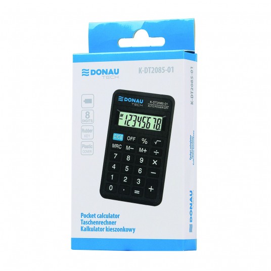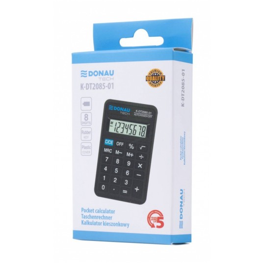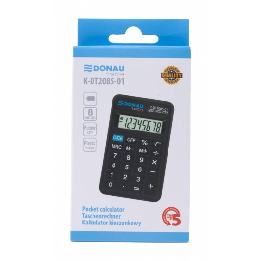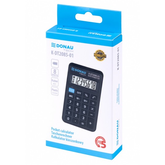- kalkulator kieszonkowy z 8-cyfrowym wyświetlaczem z zasilaniem bateryjnym - wymiary: 114 x 69 x 18 mm - funkcja pierwiastka kwadratowego oraz obliczania procentów - wyłącza się automatycznie - 5 lat gwarancji - kolor: czarny