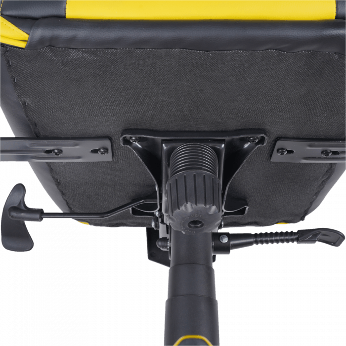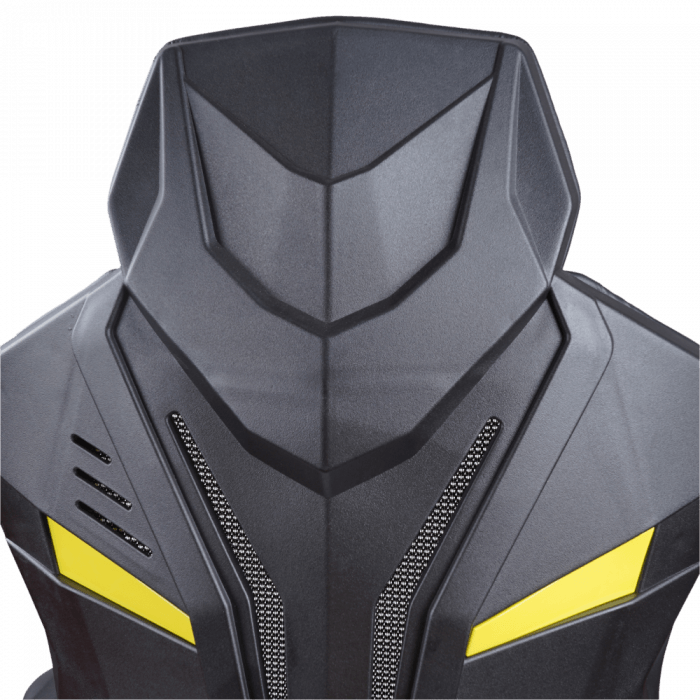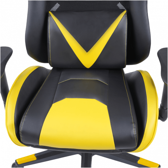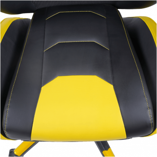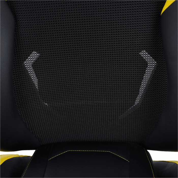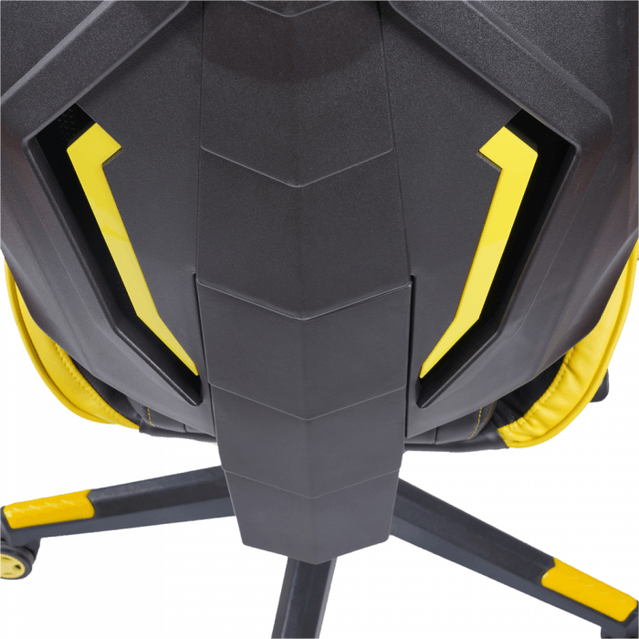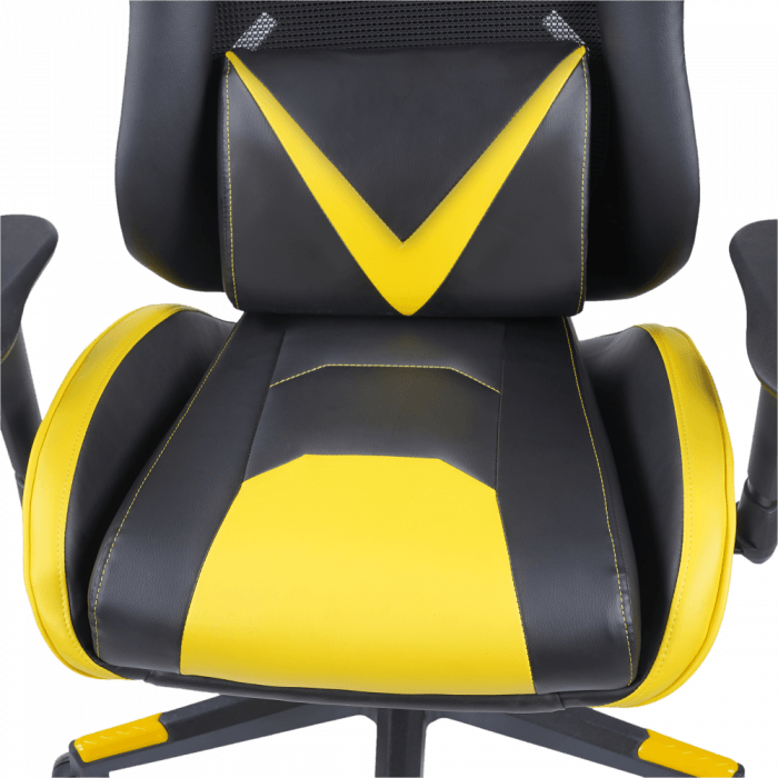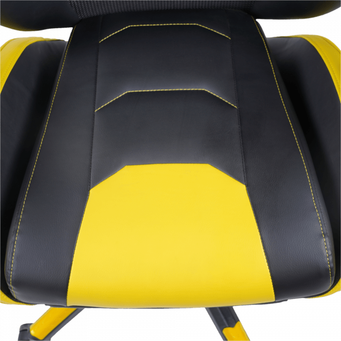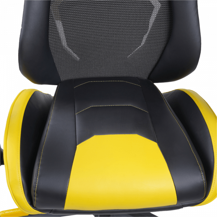 - Żółte detale wykończenia, wysoka poduszka lędźwiowa nadają fotelowi sportowego charakteru